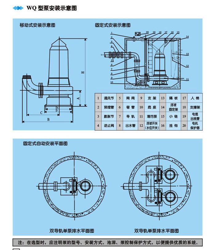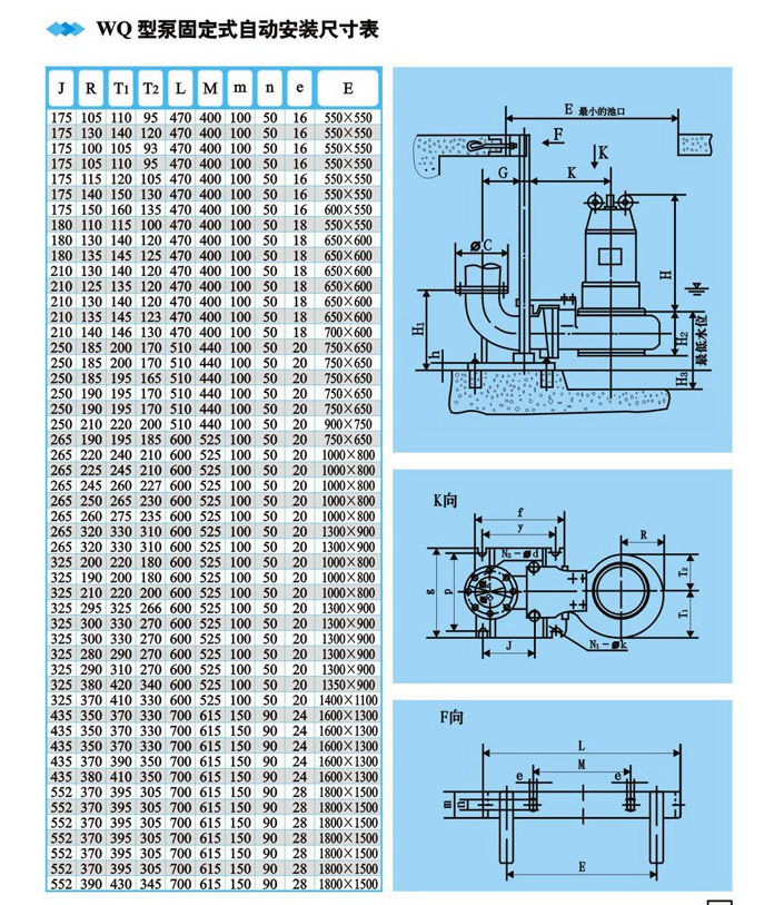 QW潛水式高效無堵塞排污泵(簡稱污水提升泵)采用大流道抗堵塞水力部件設(shè)計(jì),大大提高污物通過能力,能有效地通過泵口徑的5倍纖維物質(zhì)和直徑為泵口徑約50%的固體顆粒。設(shè)計(jì)合理,配套電機(jī)合理,效率高,節(jié)能效果顯著。機(jī)械密封采用雙道串聯(lián)密封,材質(zhì)為硬質(zhì)耐磨碳化鎢,具有耐用、耐磨等特點(diǎn),可以使泵安全連續(xù)運(yùn)行800小時以上。泵結(jié)構(gòu)緊湊,體積小,移動方便,安裝簡便,無需建泵房,潛入水中即可工作,大大減小工程造價。泵油室內(nèi)設(shè)有油水探頭,當(dāng)水泵側(cè)機(jī)械密封損壞后,水進(jìn)入油室,探頭發(fā)生信號,對泵實(shí)施保護(hù)??筛鶕?jù)用戶需要配備全自動安全保護(hù)控制柜,對泵的漏水,漏電,過載及超溫等進(jìn)行監(jiān)控,保證泵運(yùn)行可靠安全。雙導(dǎo)軌自動耦合安裝系統(tǒng),給泵的安裝的安裝,維修帶來了極大的方便,人可不必為此而進(jìn)出污水坑。浮球開關(guān)可根據(jù)所需的水位變化。自動控制泵的停啟,無需專人看管。電機(jī)運(yùn)行不過載。根據(jù)使用場合電機(jī)可采用水套式外第三者循環(huán)冷卻系統(tǒng),能保證電泵在無水(干式)狀態(tài)下安全運(yùn)行。安裝方式有固定式自動耦合安裝和移動式自由安裝二種,可滿足不同的使用場合。