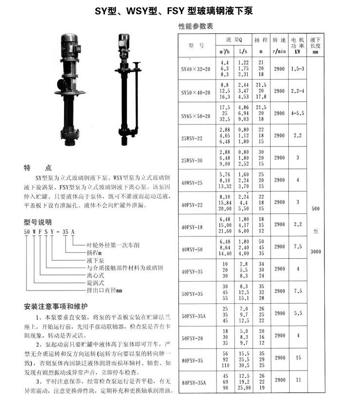公司生產(chǎn)的FSY型立式玻璃鋼液下泵,該泵因伸入貯罐,貯槽的深度長(zhǎng)短不同,設(shè)計(jì)液下深度有800mm-3000mm之間任意選擇。只要液體高于泵體,即可不灌液而起動(dòng)送液,平蓋板下設(shè)有泄漏孔,液體不會(huì)向貯灌外泄漏。 本泵與介質(zhì)接觸的零部件,系用聚已烯醇縮丁醛改性酚醛玻璃纖維,經(jīng)高溫模壓成型的酚醛玻璃鋼制件,連接管、出液管采用半干法卷制工藝制成的酚醛玻璃鋼管,葉輪軸套的裝配均用酚醛膠泥和泵軸粘成一體,液下各部裝配均用酚醛膠泥粘結(jié),伸入液下全無(wú)金屬與介質(zhì)接觸,耐腐性能絕對(duì)可靠,產(chǎn)品具有輕質(zhì)、高強(qiáng)、不變形、耐溫、耐腐蝕等優(yōu)良性能,在防腐方面可部分替代含鉬不銹鋼、鈦及鈦合金等貴重金屬。