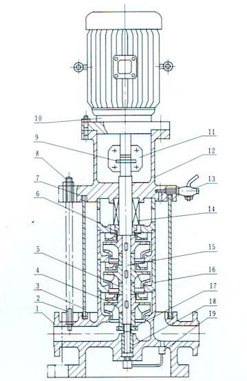 1,該泵為立式、多級節(jié)段式結(jié)構(gòu).泵進(jìn)出水法蘭處在同一直線上,葉輪采用水力平衡方式,軸向力, 泵下端有一導(dǎo)軸承.軸通過夾殼聯(lián)軸器與電機(jī)軸固定傳動.外筒為不銹鋼筒。